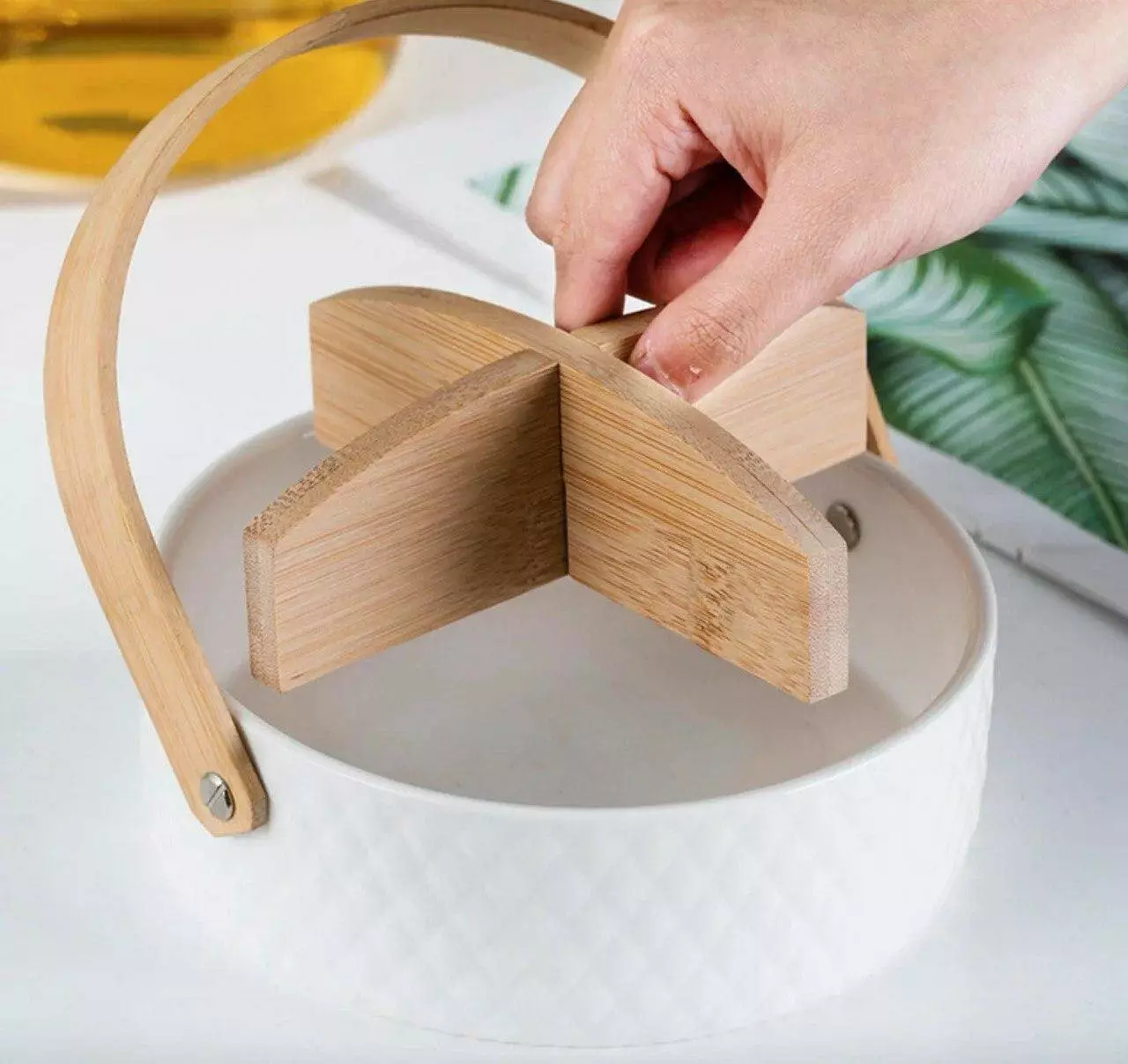 Ця елегантна монажниця з кераміки з дерев'яною ручкою ідеально