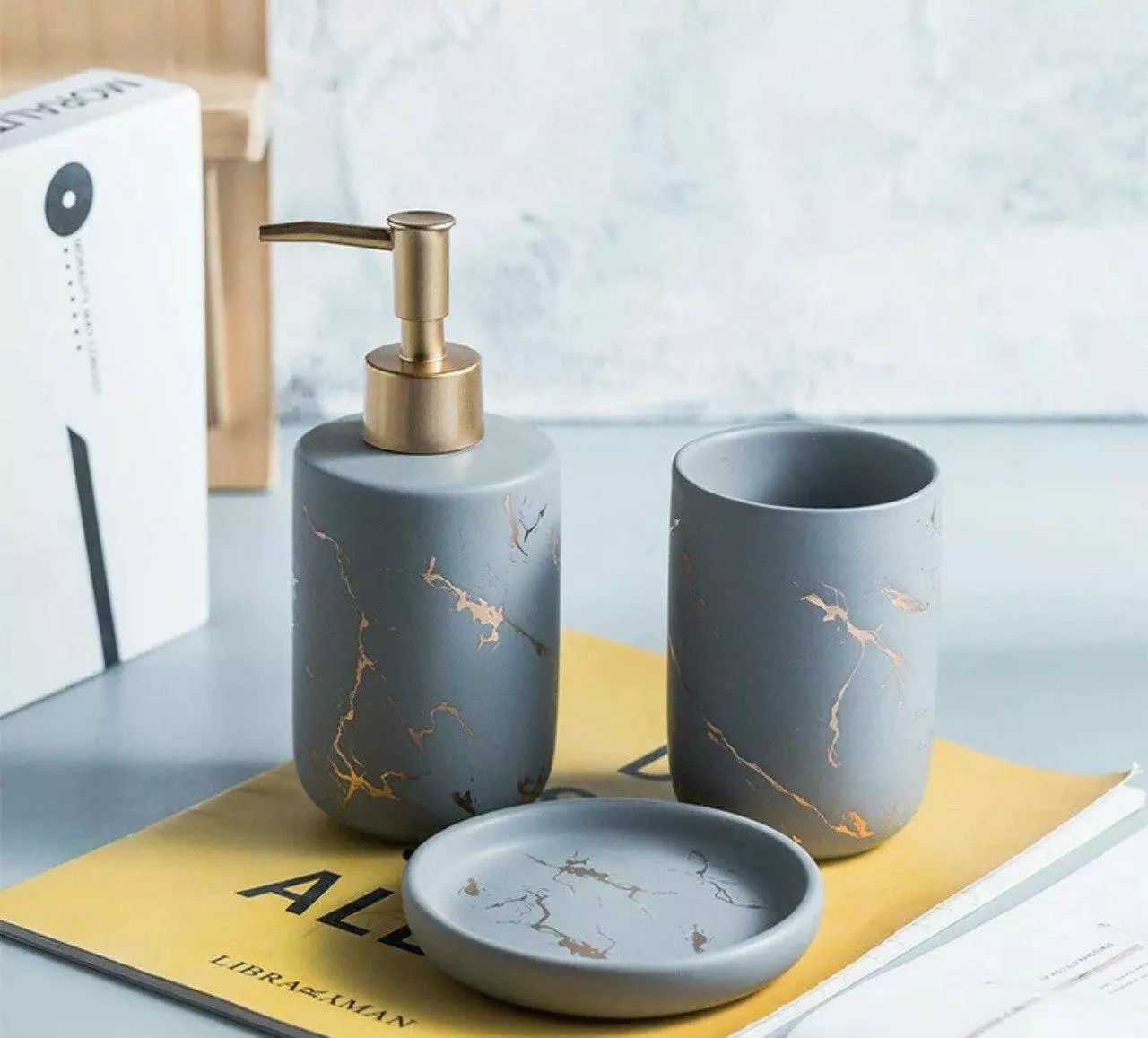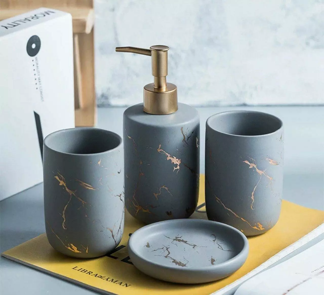 Набір аксесуарів для ванної кімнати включає чотири предмети: