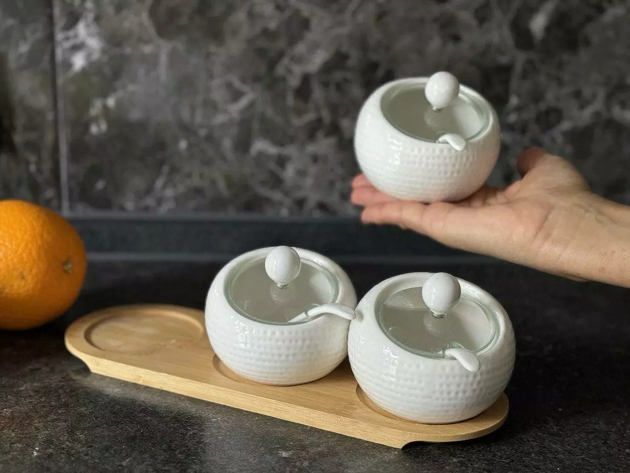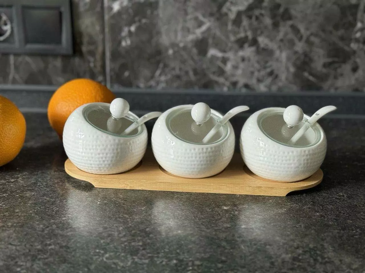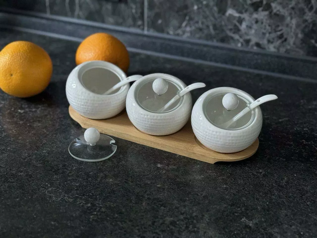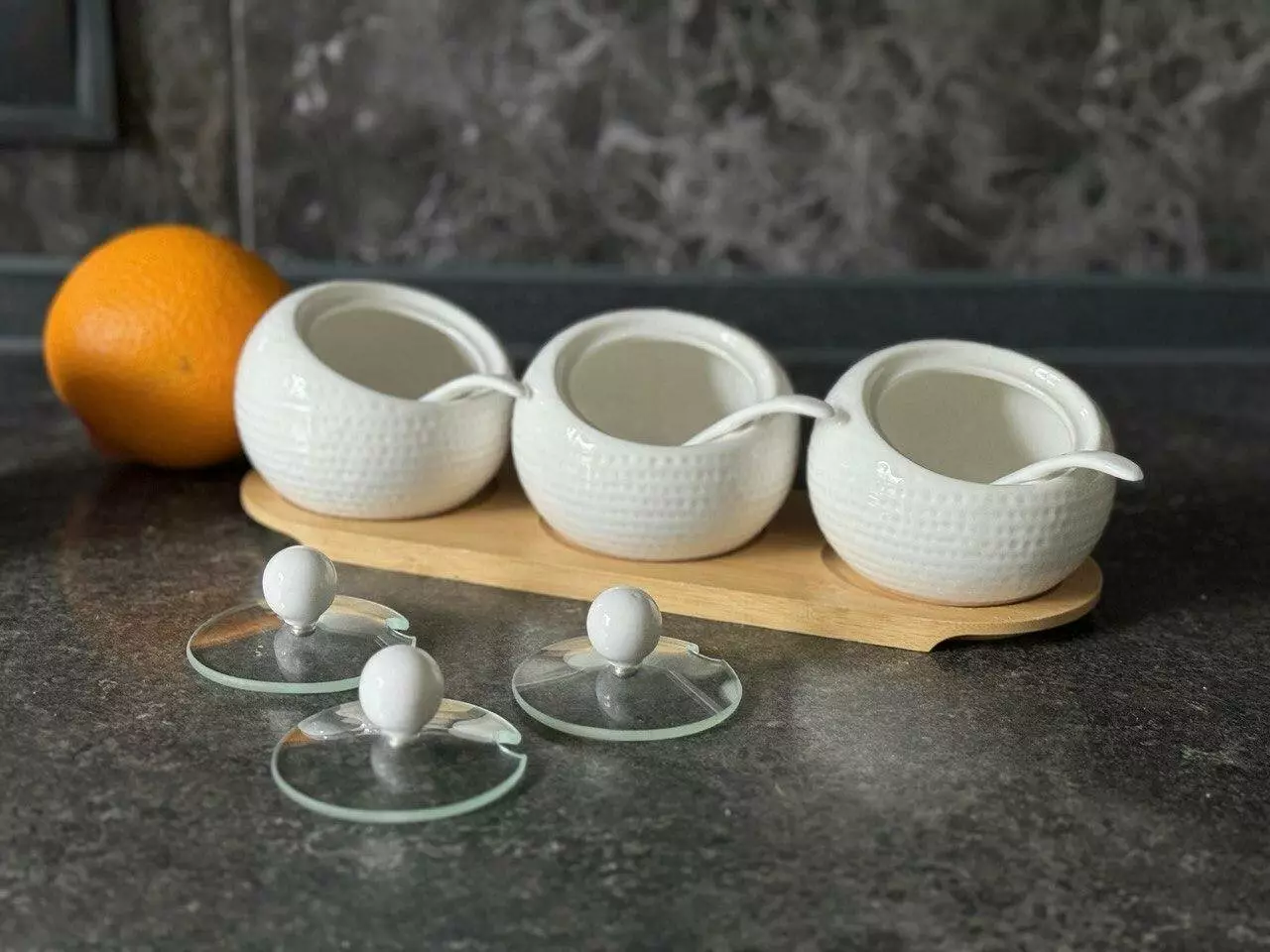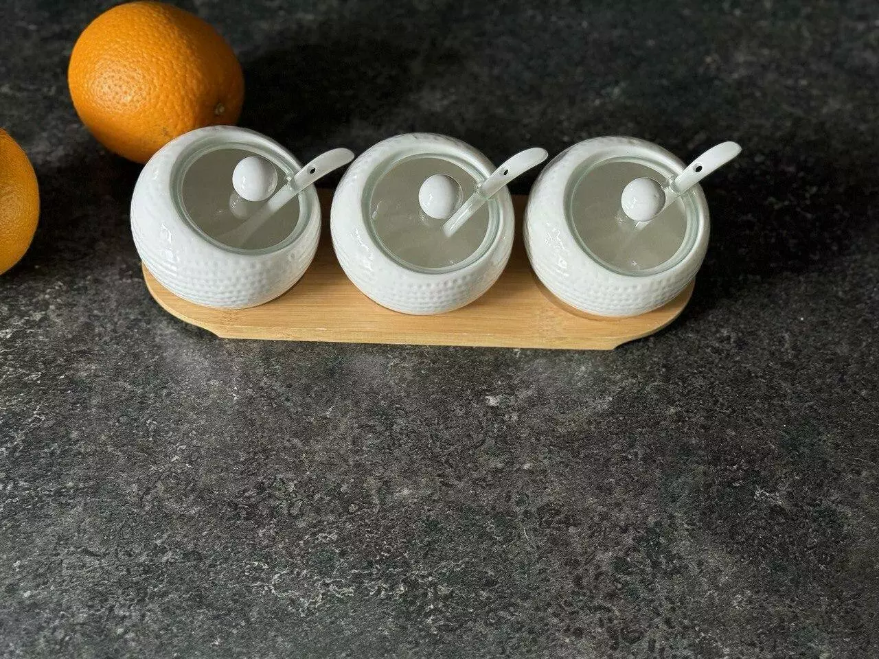 Комплектація: підставка, 3 вазочки, 3 кришки, 3 ложки