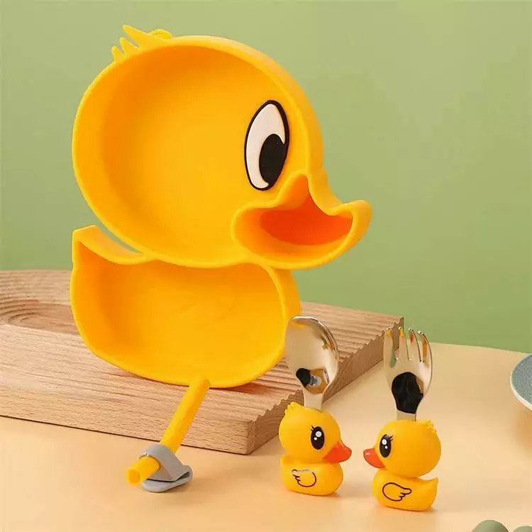 тарілка з відділеннями у вигляді каченя, вилка, ложка з