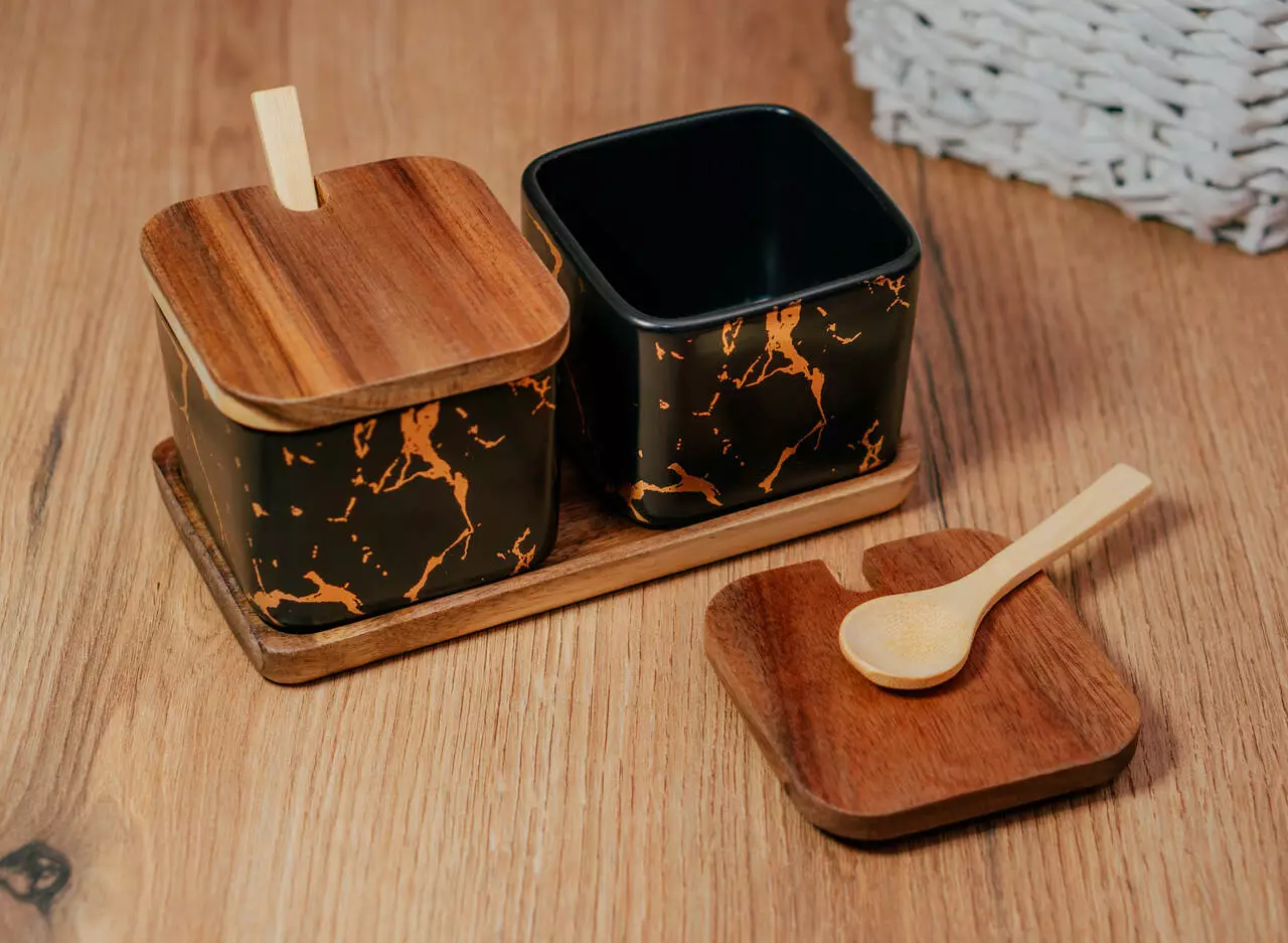 золотими візерунками та натуральне дерев'яне покриття кришок та