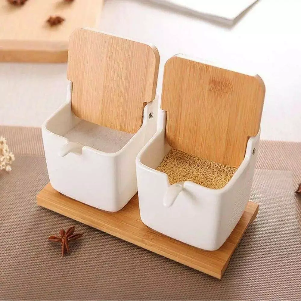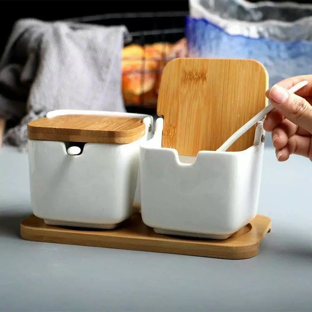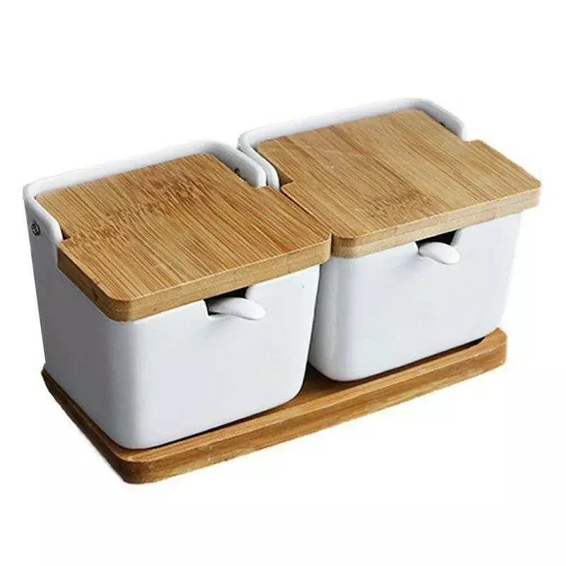наборі дві вазочки з кришками. У комплекті є керамічні ложки, для