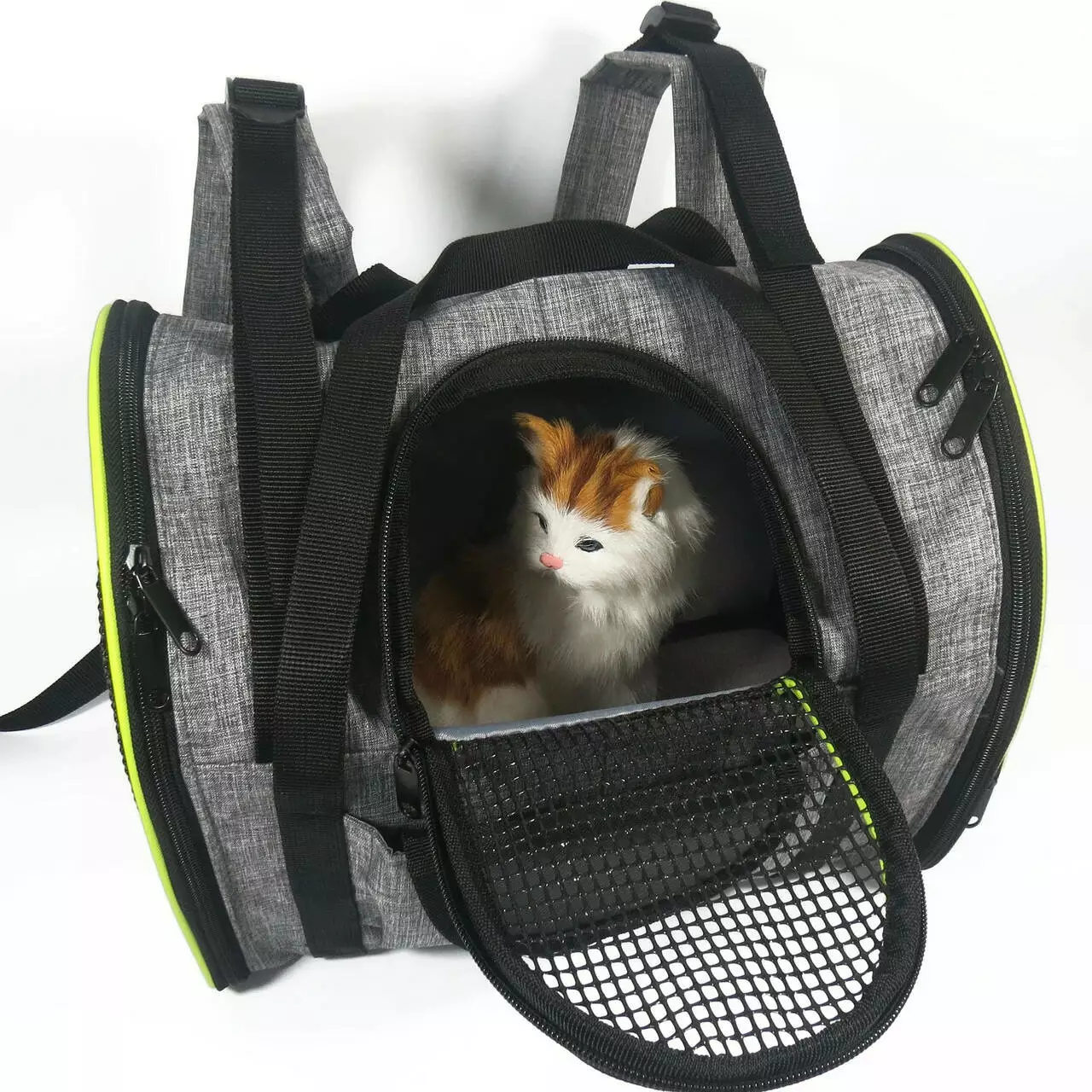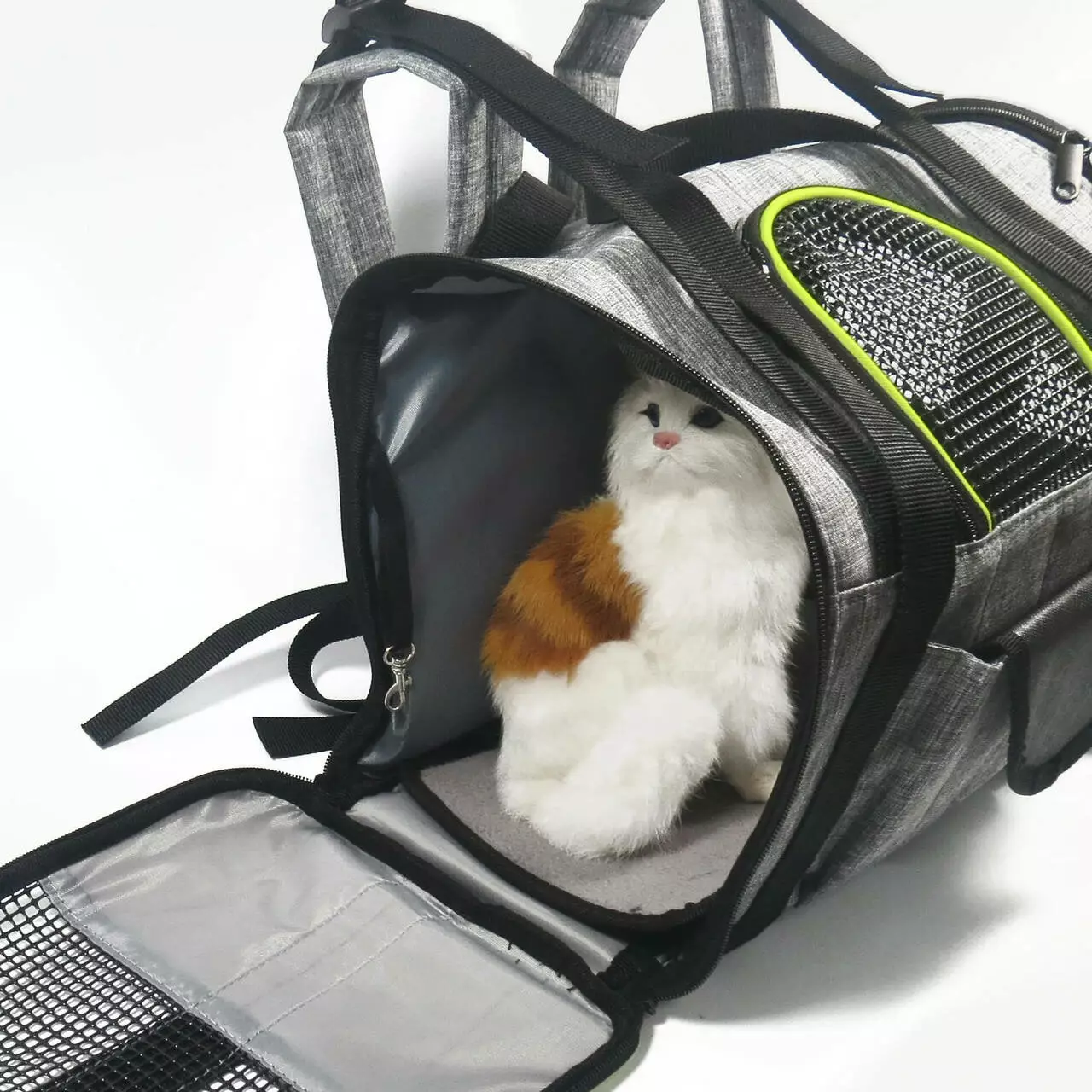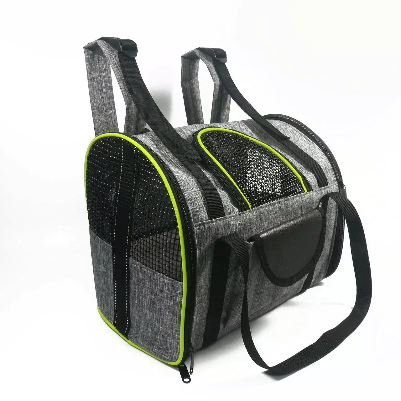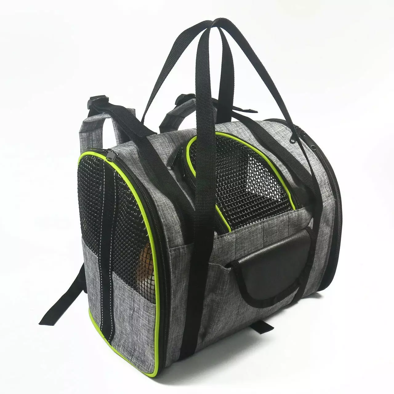 Отличным вариантом в качестве переноски для собак и кошек является рюкзак - сумка с сеткой серого цвета и зелеными полосками. Он изготовлен из прочного и высококачественного материала, который легко может выдерживать вес маленьких и средних собак и котов. По бокам и спереди имеются специальные вставки из сетки, чтобы Ваш домашний любимец мог легко дышать, т.е. они обеспечивают отличную циркуляцию воздуха. Сама конструкция максимально удобная, чтобы животное могло комфортно лежать во время передвижения. На дно кладется специальная вкладка , которая помогает рюкзаку держать форму , также , это очень удобно для поддержания чистоты , так как нет необходимости стирать каждый раз весь рюкзак , достаточно помыть вкладыш на дно.