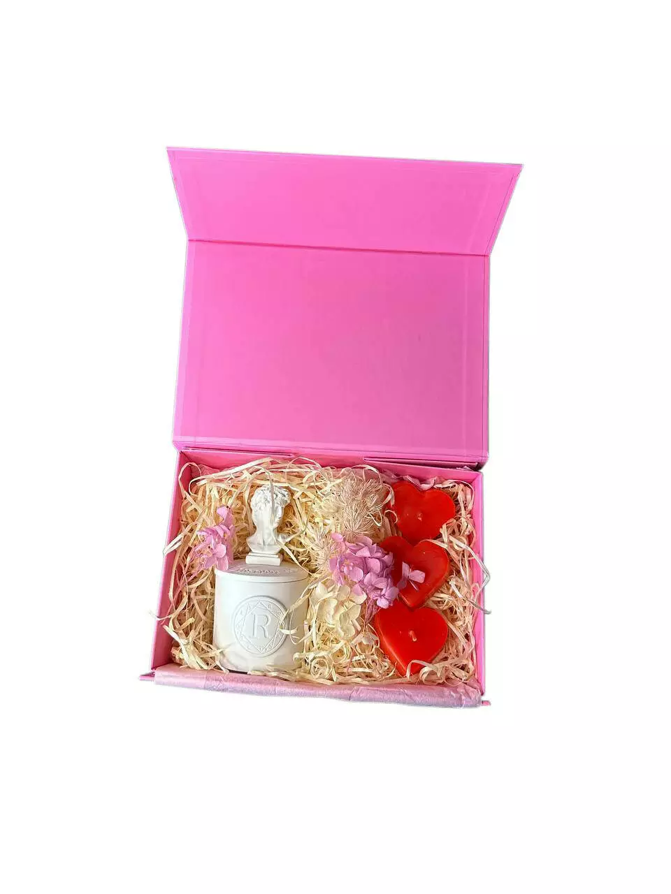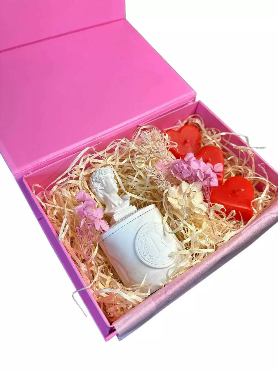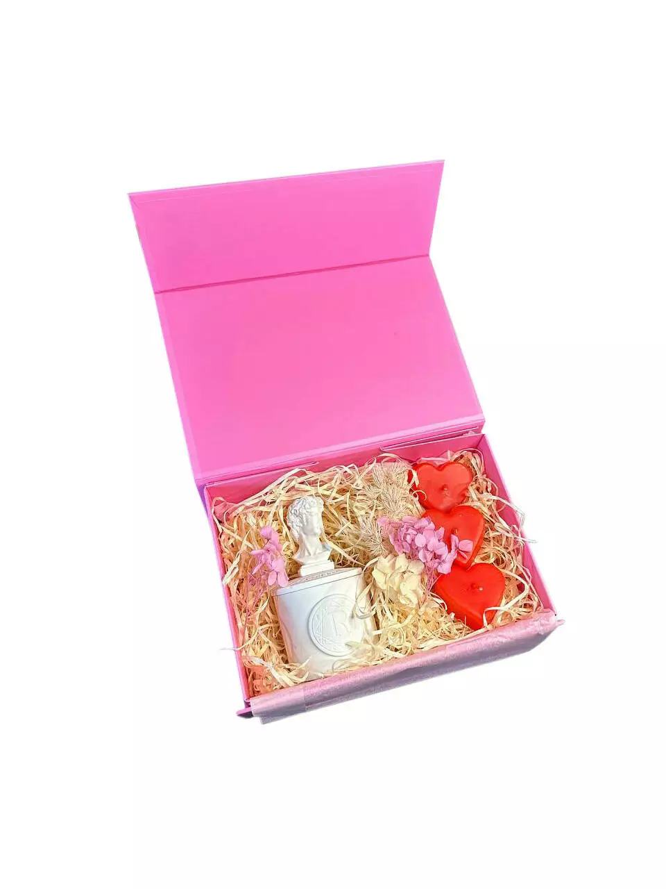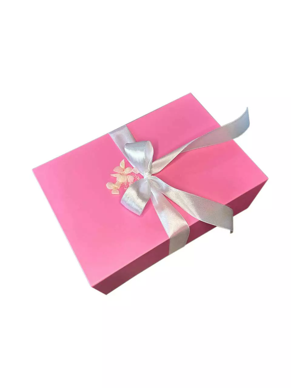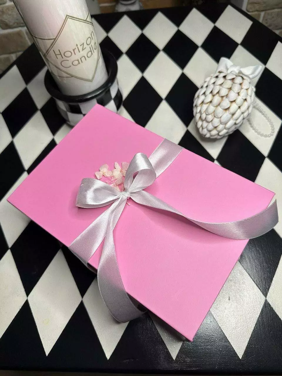 Подарунок упакований в яскраву рожеву коробку на магнітах,